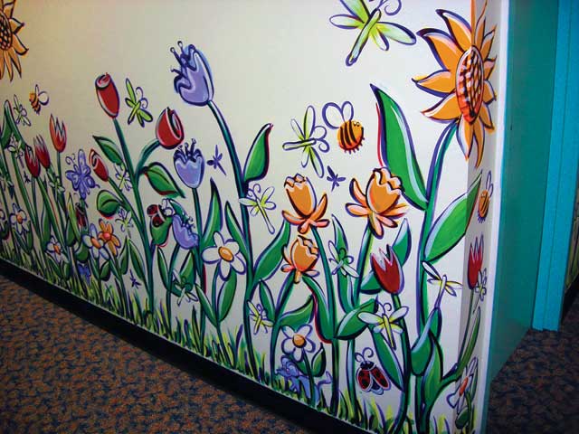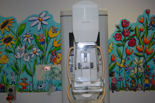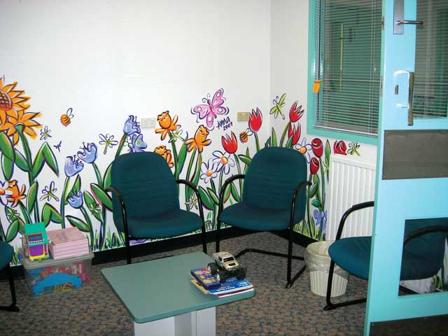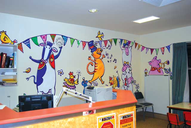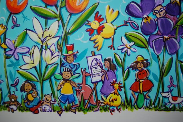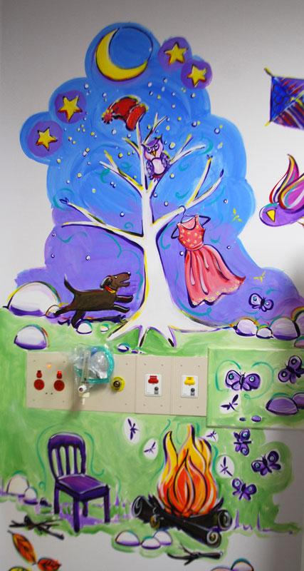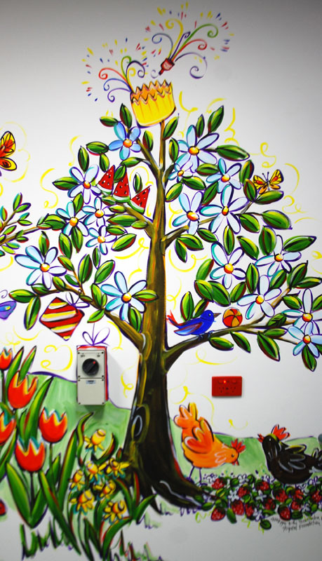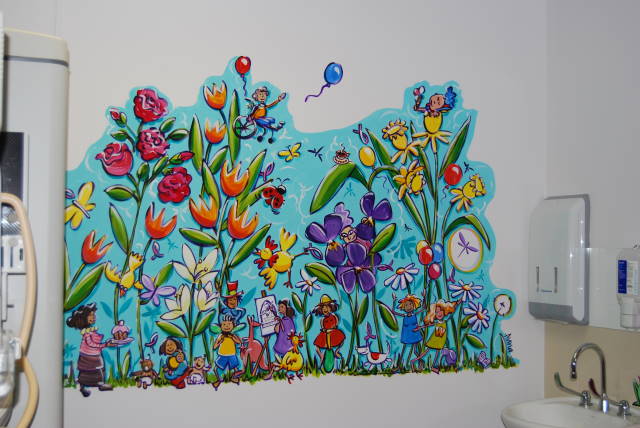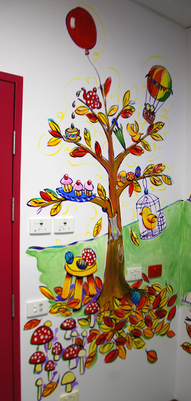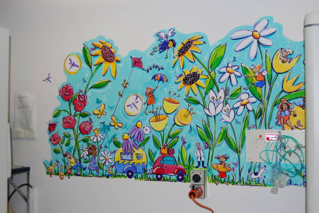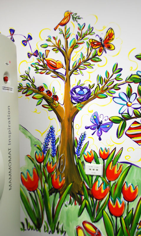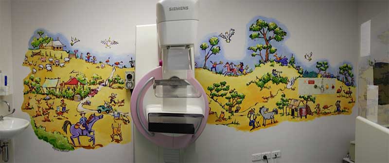 I was recently asked to do a mural in a mammogram room at Breastscreen Queensland (Toowoomba Hospital). I’ve done quite a few murals at the Toowoomba Hospital over the years, and the object of the game in this room is ‘distraction’, so there had to be a lot of quirky details.